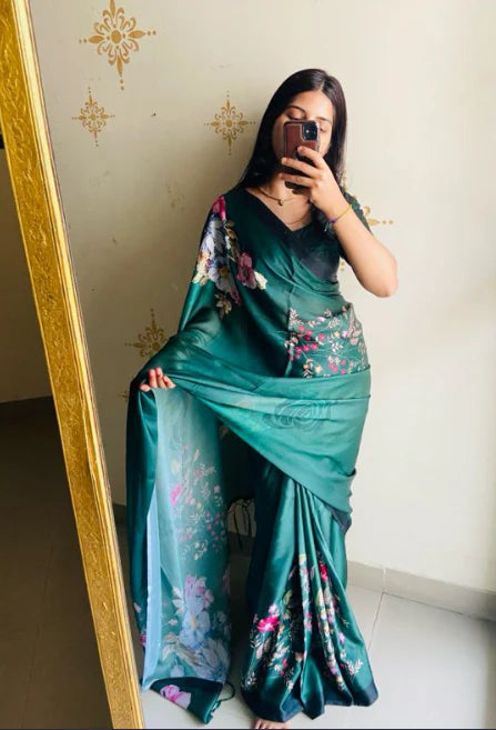 Loved the print and colour 💚…. If you can handle the satin saree then a must buy saree